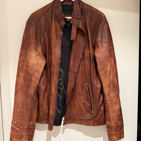 Vintage italiensk hjorteskinnsjakke i veldig god stand - kun prøvd på. Foret på innsiden og mulighet for å stramme inn i livet (se bakside). Kostet 10 000kr i sin tid. Er en str. 56 eller XXL, modellen er 190 høy og en str. L