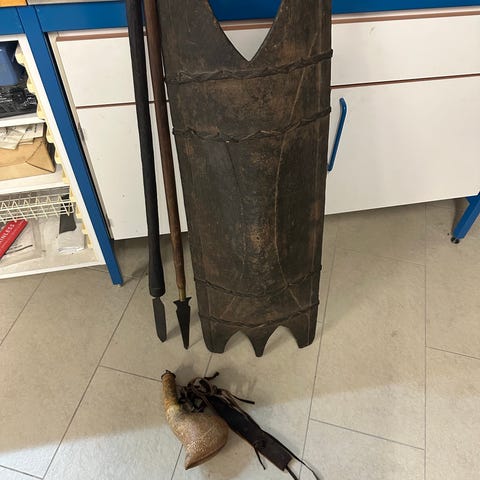 Tysklaget merke i bomull med nasjonalt symbol, kvadratisk form på 5x5 cm med 2,5 cm fiolett 'P' på gul bakgrunn, omgitt av fiolett kant. Merket ble brukt etter invasjonen i 1939 for å markere polsk etnisk opprinnelse under Nazi-Tyskland, med formål å identifisere og ydmyke polske sivilarbeidere.