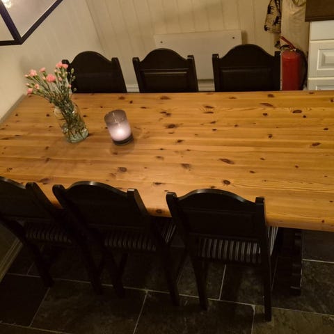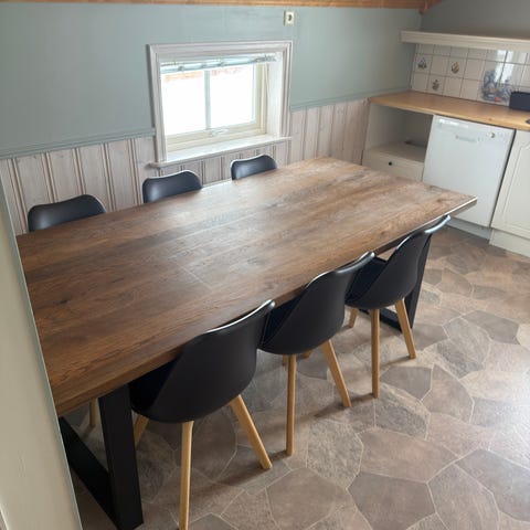 Spisebord i tre med seks matchende stoler. Bordet har en solid bordplate og kraftige ben. Stolene har treseter med polstrede seter trukket i rutete stoff. Passer til spisestue med plass til seks personer. Dette bordet kan pusses, oljes og males ettersom hvordan man selv ønsker å ha det, normal bruksslitasje finnes, men generelt helt og pent. Er åpen for fornuftige bud. For mer info, så ring eller send melding. Telefonnr: 99327446