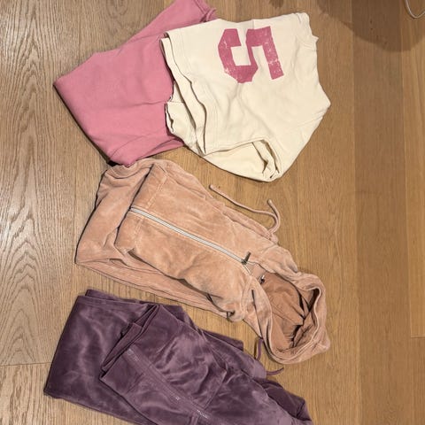 3 bukser som ser ut som jeans/bukser som er tights, 1 dongeribukse, 1 sort hjemmesydd ullbukse (den med "N"), kort ullkjole lilla, to hettegensere (Levis og HM m Harry Potter tema), ferskenfarget hettejakke, sort bukse Puma og en fløyelstights fra Name it, 2 grå dongeribukser og en Harry potter-Hedwig kjole.