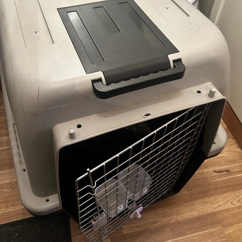 Metallbur til hund el. kjæledyr med plastbunn. Skrå side som gjør at det passer i biler med skrå bakluke. Buret har to dører og er sammenleggbart .