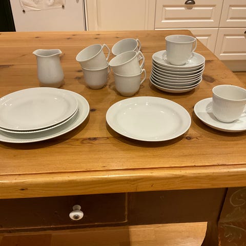 Selger 11 dype tallerkner til suppe, grøt , 20 cm i diameter, pent brukt med enkelte nerker i glassuren på noen. 150 pr stk.Selger også en stor rund serveringsbolle 26 cm i diameter øverst, 9,5 cm høy, Saturn Platinum, sølvkant, Porsgrunn Porselen, liten bolle og 13 middags tallerkner, sausemugge, stort hvitt Saturn fat, se mine andre annonser. Serviset har en enkel og tidløs design med hvit farge og grå/sølv kantdetaljer. Materialet er porselen som gir holdbarhet og egner seg for daglig bruk. Ett veldig klassisk og pent servise
