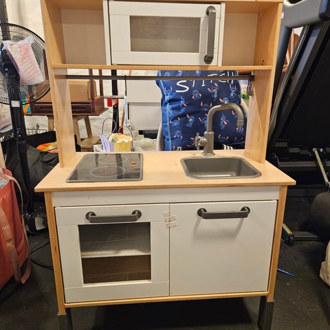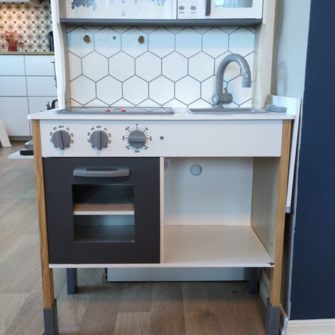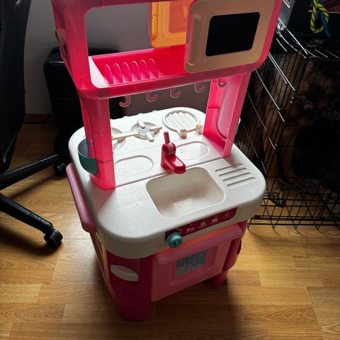 Pent brukt lekekjøkken med diverse gies bort, må vaskes av.