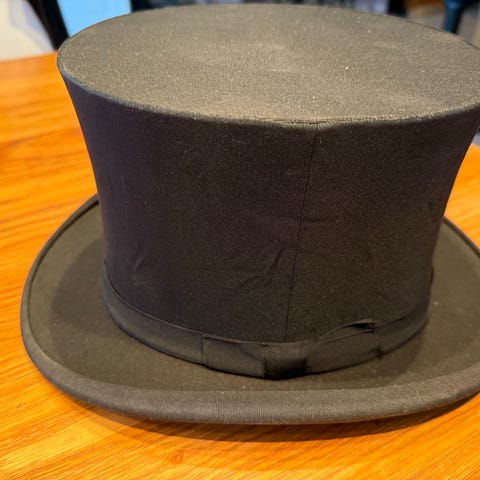 Original antikk flosshatt (silkehatt) fra ca. 1895–1910, levert av Hans H. Holm, Oslo – Kgl. Hofleverandør.