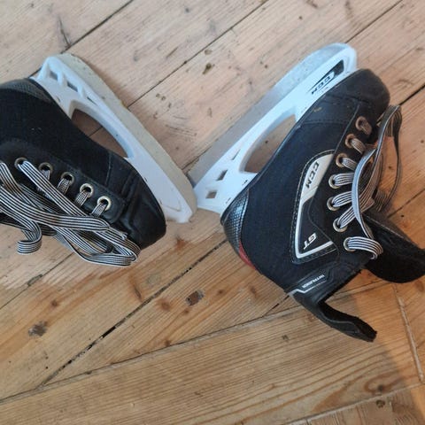 Barne skøyter i størrelse 27, beregnet for ishockey. Skøytene har justerbar størrelse fra 27 til 30, med hvit, blå og svart fargekombinasjon. Materialet inkluderer både tekstil og plastdetaljer for støtte og komfort.