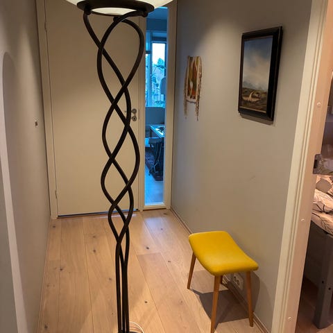 Stålampe med bevegelig arm for å justere høyde. Retro look. Mattlakkert i en blågrå farge. Bryter på ledningen.