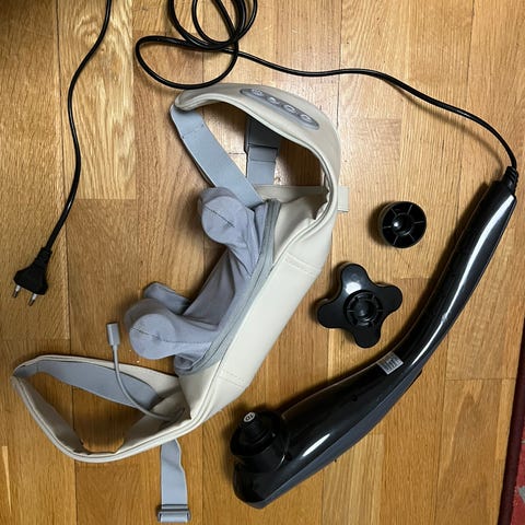 Nordic elektrisk nakke- og skuldermassasjeapparat i sort farge. Apparatet har kontrollpanel med flere funksjoner for justering av massasjeinnstillinger. Leveres med strømadapter for tilkobling til strøm.