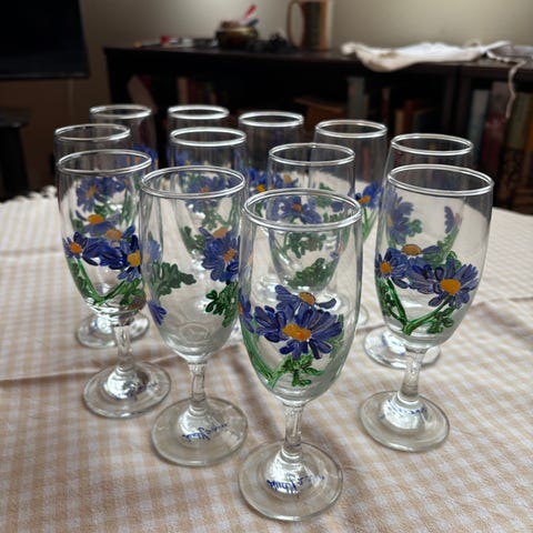 Håndmalt blå glass med dekorative motiver i hvitt og blått. Glassene har en høy stilk og en rund fot.