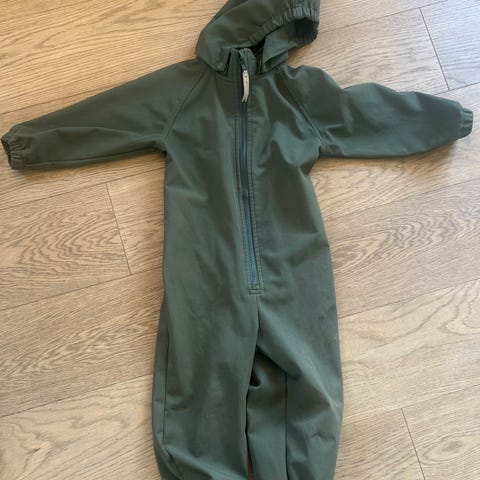 MINI A TURE softshell dress i blå farge, størrelse 98, designet for unisex bruk. Dressen har avtagbar hette og glidelås foran, elastiske mansjetter ved armer og ben, samt justerbare stroppdetaljer. Vanntett og vindtett. Materialet er egnet for barn og gir komfortabel passform. Veldig pent brukt.