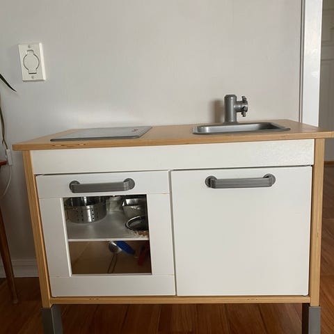 IKEA lekekjøkken i blått og hvitt med komfyr, vask med kran, oppbevaringsskap og overskap. Lekekjøkkenet har detaljer som kokeplater med lys (1 som virker og 1 som ikke gjør det), ovnsdør med håndtak, og hyller for oppbevaring. Passer for barn til lek og rollelek.