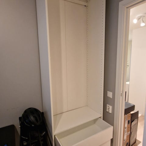 Et dobbelt og et enkelt Pax garderobeskap med heng og hylle på toppen