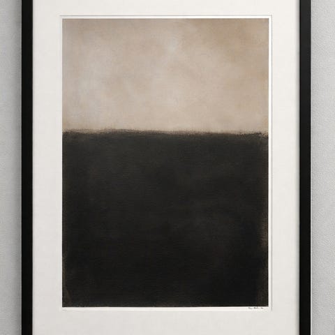 Verket har en dyp, rolig fargepalett der mørke, nesten nattlige toner glir over i varme jordfarger. Overgangen mellom det mørke og det lyse skaper en følelse av stillhet, tyngde og balanse – et bilde som gir rommet en rolig, sofistikert og litt mystisk atmosfære. Passer like godt i moderne som klassiske interiør.