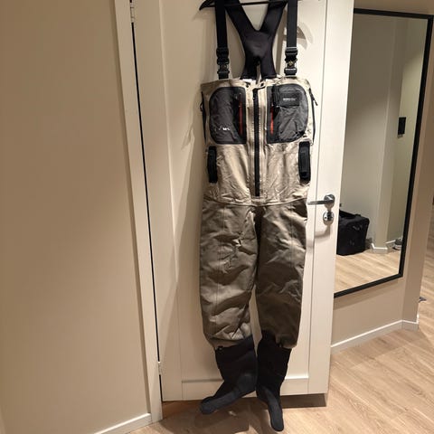 Fabrikk ny og ubrukt Simms Tributary vadebukse i fargene grønn og tan. Størrelse Ls, som er en Large bukse i kortere utgave.