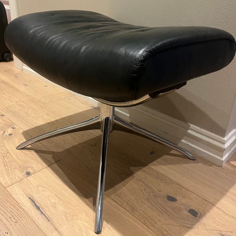 Ekornes fotskammel i skinn har tilhørt en stressless stol, men selges uten stolen.
