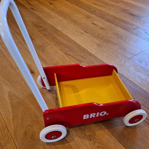 Brio gåvogn selges. Et par hakk i malingen, men fungerer som den skal. Må hentes.