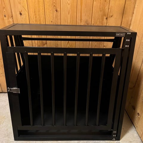Hundebur som er lakka selges, trenger en runde med lakk igjen 😊 Bakveggen og bunnen er forsterket med tykkere plater , hull i bakveggen for montering av vifte. Jeg har skilleveggen og originale bakveggen som jeg har satt inntil bakveggen når jeg har skilleveggen i buret. Ca mål på bunnen er 100*100 og 75 i høyden . Bakveggen skrår.