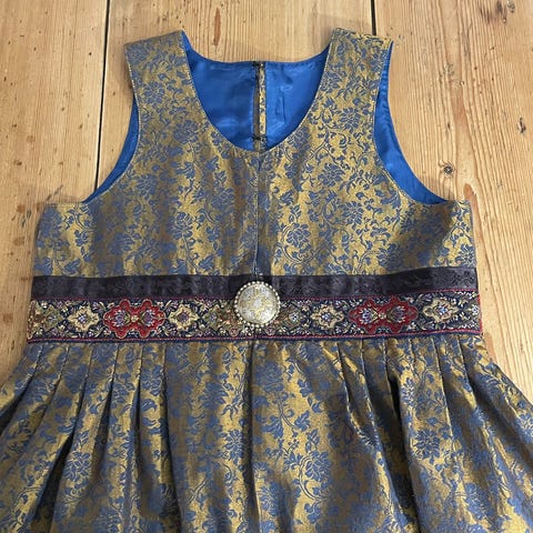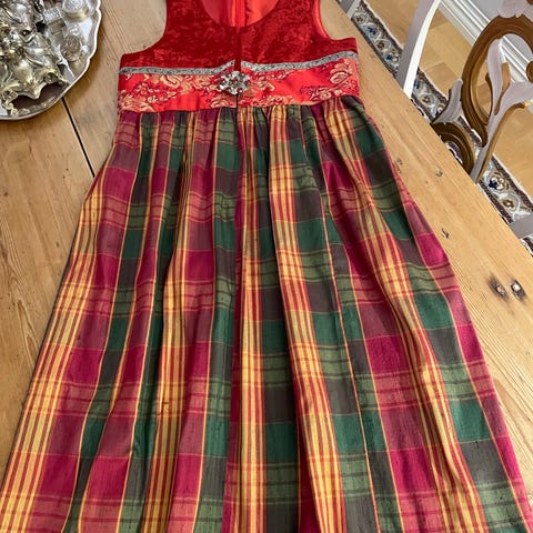 Hjemmesydd festdrakt som kan passe fra ca 4-8 år tror jeg. Følger med to skjorter, en rutet flerfarget, og en hvit i engelsk blonde, og belte i lær. Stakken kan enkelt legges opp og ned ved å flytte knapper på selene og/eller sy opp eller ned på stakken/skjørtet.
