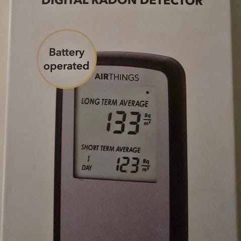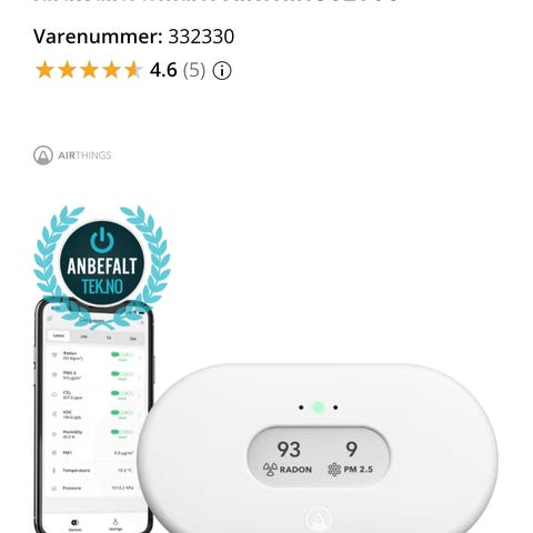 Airthings Digital Radon Detector er en bærbar radonmåler som drives med batteri. Den gir raske resultater innen 24 timer og kan enkelt flyttes mellom rom eller bygninger. Enheten måler langtidsgjennomsnitt og korttidsgjennomsnitt av radonkonsentrasjon i luft, angitt i Bq/m³. Produktet krever 3 AAA-batterier og har en levetid på 2 år.