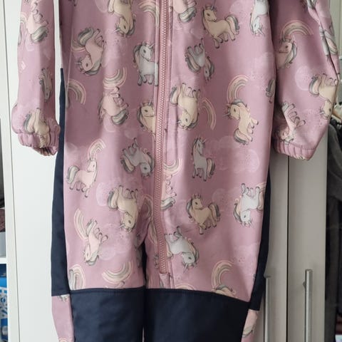 Myk og behagelig fleece/softshell-dress med hette og glidelås, samt forsterkninger på knær og rumpe – perfekt som overgangsdress vår/høst eller som mellomlag på kaldere dager. Ingen hull eller skader, kun normal bruk.