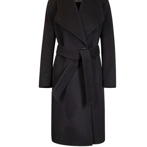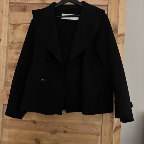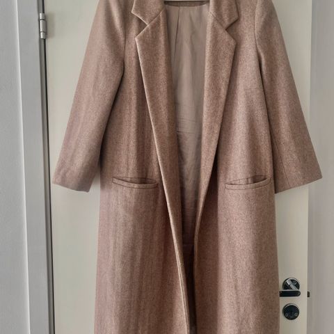 Varm kåpe fra Ganni i størrelse 36, laget av ullblanding. Jakken har belte og lommer.