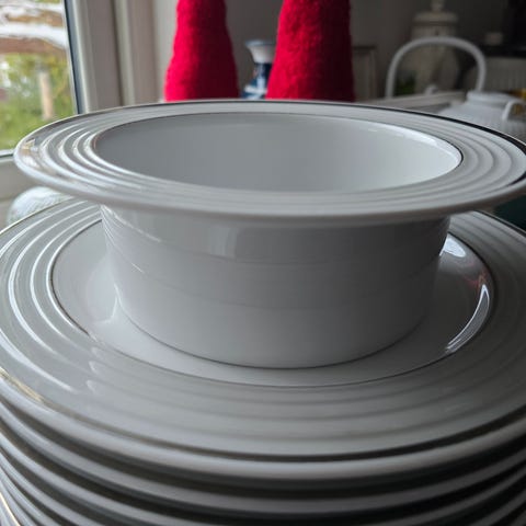 Selger også en stor rund serveringsbolle 26 cm i diameter øverst, 9,5 cm høy, Saturn Platinum, sølvkant, Porsgrunn Porselen. Har også liten bolle og 7 middags tallerkner, se mine andre annonser. 11 dype tallerkner