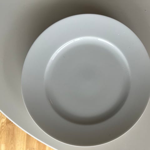 Selger et stort rundt hvitt serveringsfat, 32 cm i diameter.