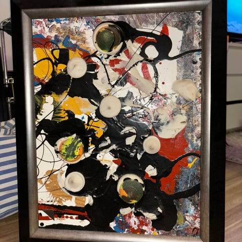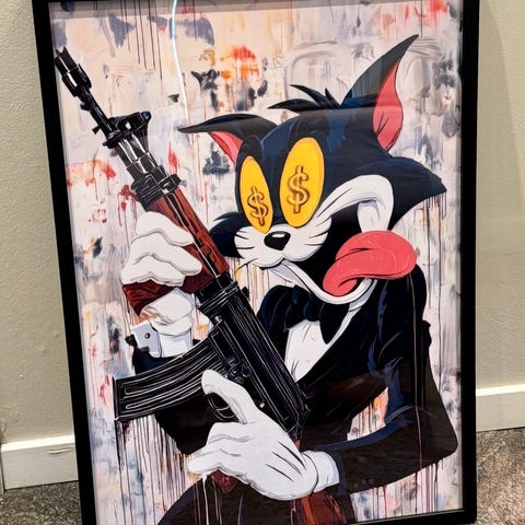 Selger et uttrykkssterkt og moderne kunstverk av Art Ranger / Ingar Aasen. Bildet har et rått og energisk uttrykk med kraftige røde, sorte og hvite kontraster, og passer perfekt som statement-piece i moderne hjem, trappeoppgang, stue eller kontor.