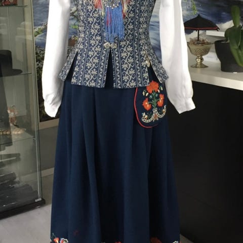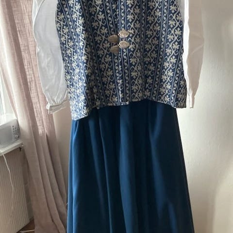 Nord Trøndelagsbunad i størrelse M, Blå medfølgende skjorte(en tråd har løsnet,men bare og sy fast), veske med brodering, sjal og lue med brodering som skjørtet.. Bunaden er tykk og har broderte detaljer i bunnen og på lomme. Materialet er ull. Dette er en todelt bunad og veldig behagelig og gå med. Dette er en gammel bunad, men brukes ikke og kanskje noen vil ha større glede av den enn meg.