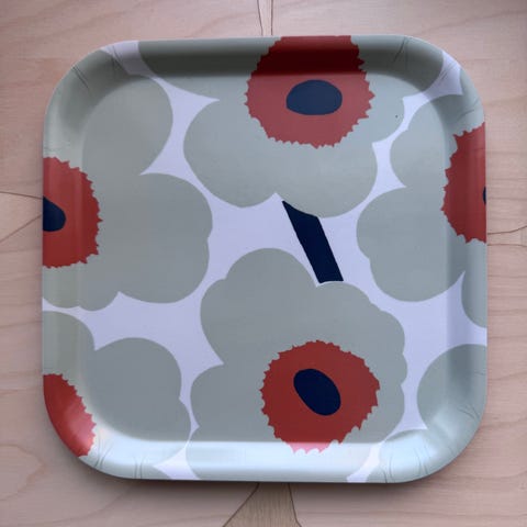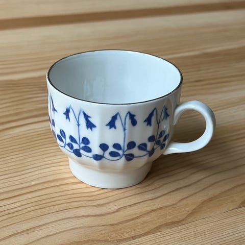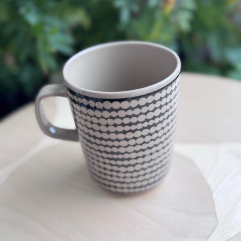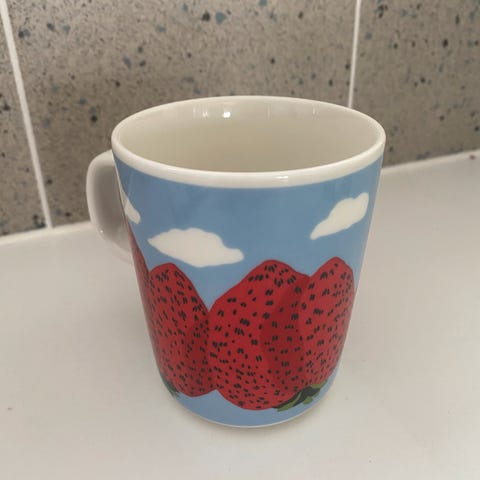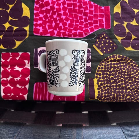 Selger 1 kopp fra merket Marimekko Siirtolapuutarha, med en kapasitet på 4 dl. Koppen er hvit med svart og rosa blomster- og naturmønster. Laget av porselen, egnet for daglig bruk.