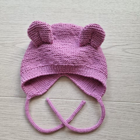 Supersøt Vibes Teddykyse strikket i Baced Vibes garn som er av 60 % ekstra fine alpakka og 40% baby alpakka . Fargen har navnet kaketopper som er lys rosa . Garnpris 120 kr pr nøste . Størrelse 1-3 mnd . Barnelue laget av ull i rosa farge, størrelse 62, beregnet for jenter. Luen har knyting under haka for bedre passform og dekker hodet godt for å gi varme. Har 2 like luer til salgs . Luen kan vaskes på ullprogram