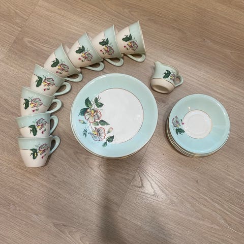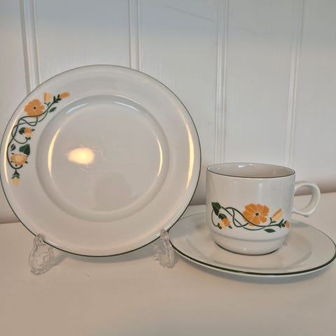 3 kopper, 6 asjetter, 3 frokostskåler, 3 suppe/dessert boller, et stort og et lite serveringsfat, en sausemugge. Selges samlet.