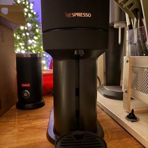 En Nespresso kaffemaskin med moderne design, vannbeholder på siden, justerbare bryggeinnstillinger og en avtakbar dryppskål.