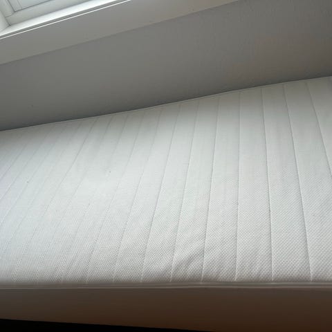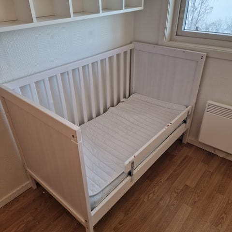 Pent brukt barneseng gis bort med madrass, overmadrass, sommerdyne og pute + laken