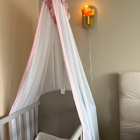 Sengehimmel på fot til baby/barn. Ca 160cm høy. To hvite kapper med kroner på.