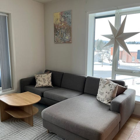 Sofaen er pent brukt og godt tatt vare på, med normal slitasje. Stoffet er slitesterkt og behagelig, og sofaen har god sittekomfort.