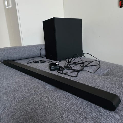 Selger en Samsung HW-H750 soundbar (4.1-kanals) med tilhørende trådløs subwoofer. Gir mye bedre lyd enn TV-høyttalere – god bass og klar dialog, perfekt til film, serier og musikk.