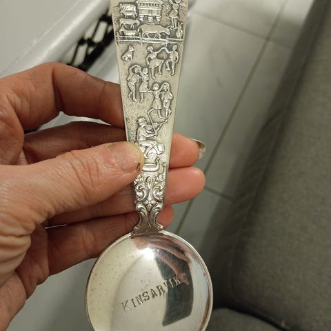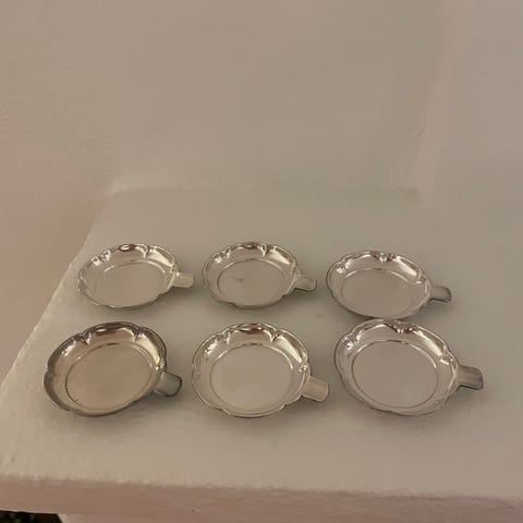 Dette er mokkaskjeer i forgylt sølv og emalje, laget av den berømte norske sølvsmeden Axel Holmsen. Type: Mokkaskjeer (kaffeskjeer). Materiale: De er laget av 925 sterlingsølv, som deretter er belagt med gull og dekorert med flerfarget emalje. Design: Hver skje har et emaljehåndtak i forskjellige farger, ofte med et mønster under emaljen (guilloché), som skaper en vakker effekt. Selve skjeene er stemplet av mesteren Axel Holmsen og stemplet 925S. Disse skjeene er populære samleobjekter og er kjent for sitt delikate og fargerike design.