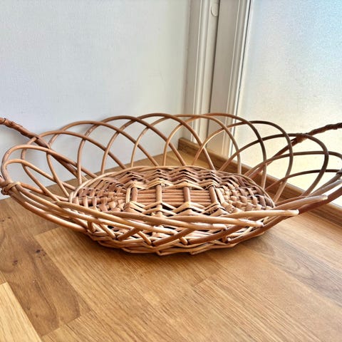 kurv, flettverk, etasjefat, fruktfat, fruktkurv, rotting, pil, naturmateriale, interiør, dekorasjon, landlig, rustikk, bohem, cottagecore, kjøkkenutstyr, servering, oppbevaring, håndverk, vintage, retro, bordpynt, hytteinteriør, sommerhus, kurvmøbler, flettet kurv, etasjer, bærehåndtak, brun kurv, naturlig stil, hus og hjem, gjenbruk, interiørtips, borddekking.