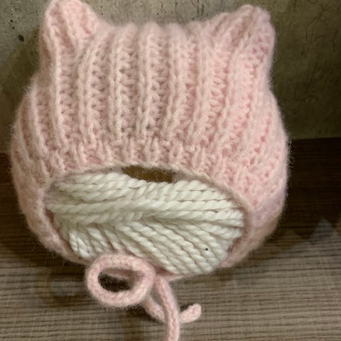 Supersøt Vibes Balaclava strikket i Baced Vibes garn som er av 60 % ekstra fine alpakka og 40% baby alpakka . Fargen har navnet kaketopper som er lys rosa . Garnpris 120 kr pr nøste . Størrelse 6-9 mnd .