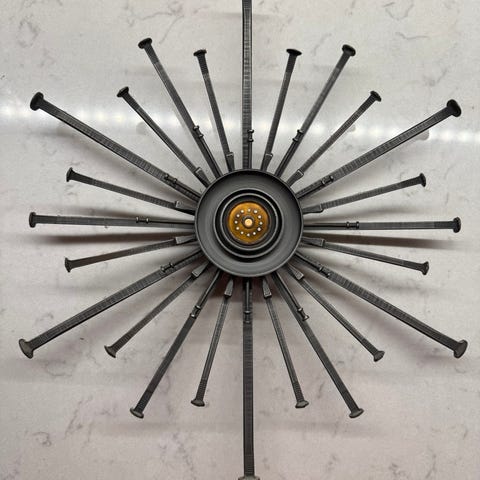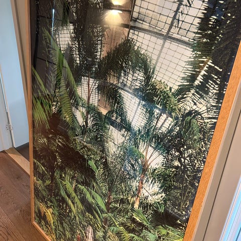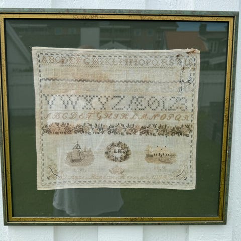 Broderte blomster innrammet i gullfarget metallramme. Hver ramme inneholder et unikt blomsterdesign, laget med korssting på hvit bakgrunn. Fire av rammene er med glass, den minste er uten glass. Alle kan kobles sammen eller henges hver for seg. Det er fire rammer i lik stil og en litt mindre som er i gullfarget plast.