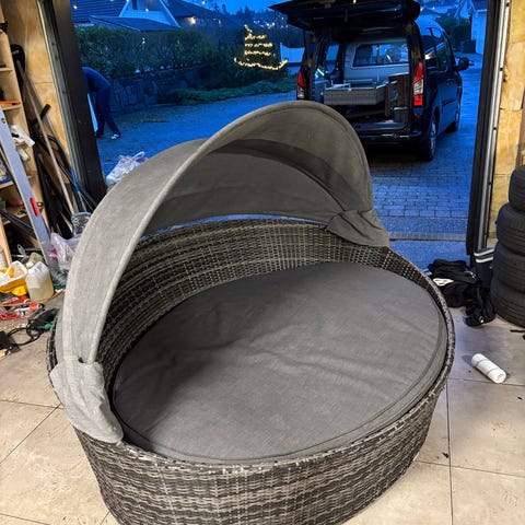Rund solseng laget av rattan med justerbar baldakin. Inkluderer puter og madrass i beige farge. Egnet for utendørs bruk og gir mulighet for skygge og komfort.