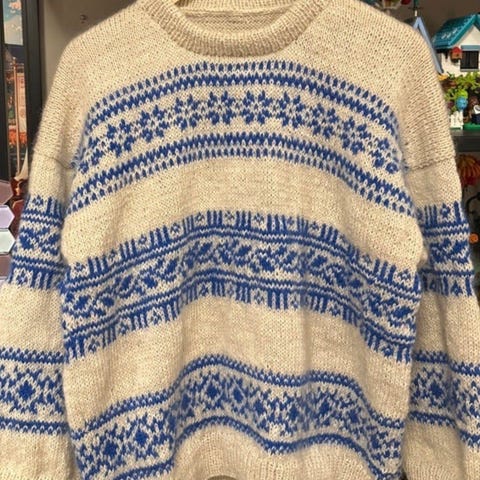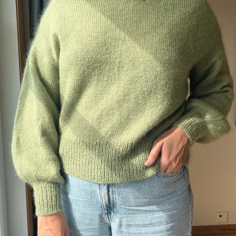 Ballongsweater strikket i KFOmerino og Isager silk mohair i farge dusty green. Selges kr 900,-.