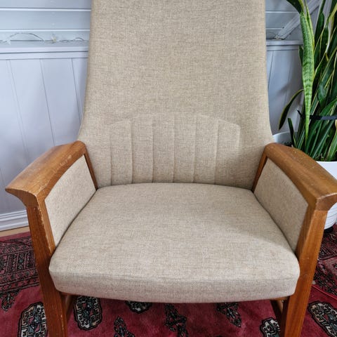 Lenestolen er trukket om. Jeg er usikker på årgang, men tror den er fra 1940-tallet (muligens 1950-tallet). Den trenger litt fiksing, blant annet må armlenet limes sammen, og undersiden av setet må repareres.