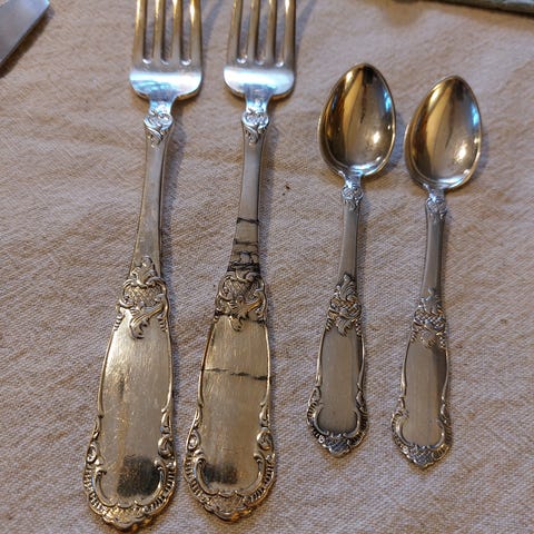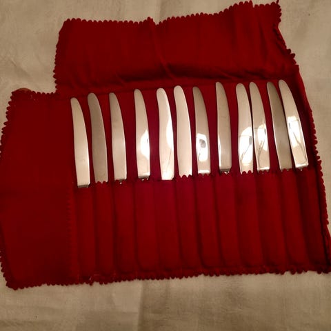 12 stk teskjeer. Kake spade . 1stk kompott skje. 2 store serveringsskjeer (isskje)