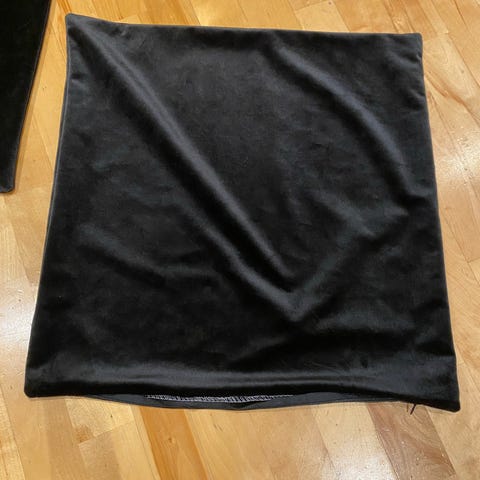 Pent brukte Søstrene Grene pynteputer i grå imitert pels. Selges samlet med innerputer for 100 kr.