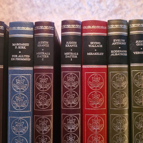 Antik bokserie med skinnrygg og dekorative mønstre på omslaget. Bøkene har gullpregede detaljer på ryggen.