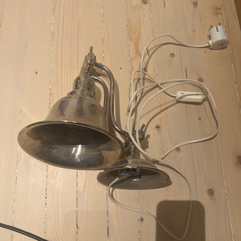Vegglampe i metall og plexiglass. Utført i space age - atomic stil. Henges enkelt på veggen. Vanlig leding med støpsel som passer i alle uttak.