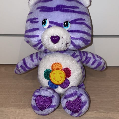 Care Bears kosedyr bamser i flere farger inkludert rosa, blå og grønn. Myke tekstilmaterialer med broderte detaljer som regnbue, hjerte og måne på magen. Passer som samleobjekter eller leker for barn..ønskwr bud kan sendes not porto ..den største er nå solgt .resten er ledig