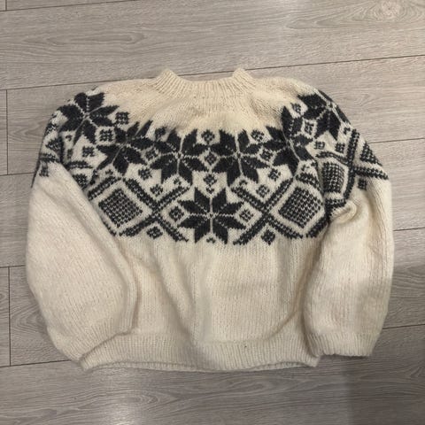 Brukt høyhalset ullgenser med raglanermer selges rimelig kroner 225 ferdig pruta.