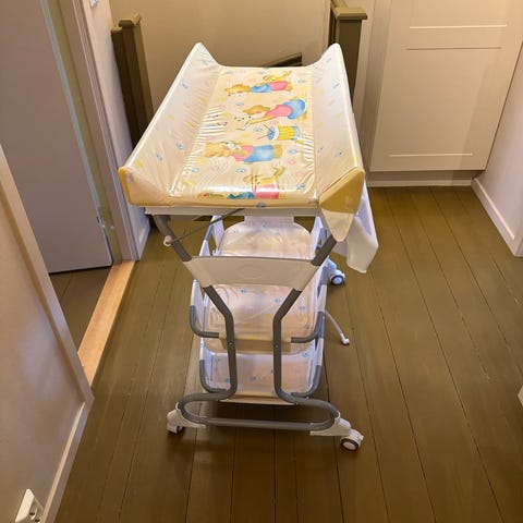 Godt brukt stellebord med badekar. Stekeplaten er løs men kan repareres. Ekstra stellematte som er løs følger med, denne kan evt. brukes på toppen. Må hentes